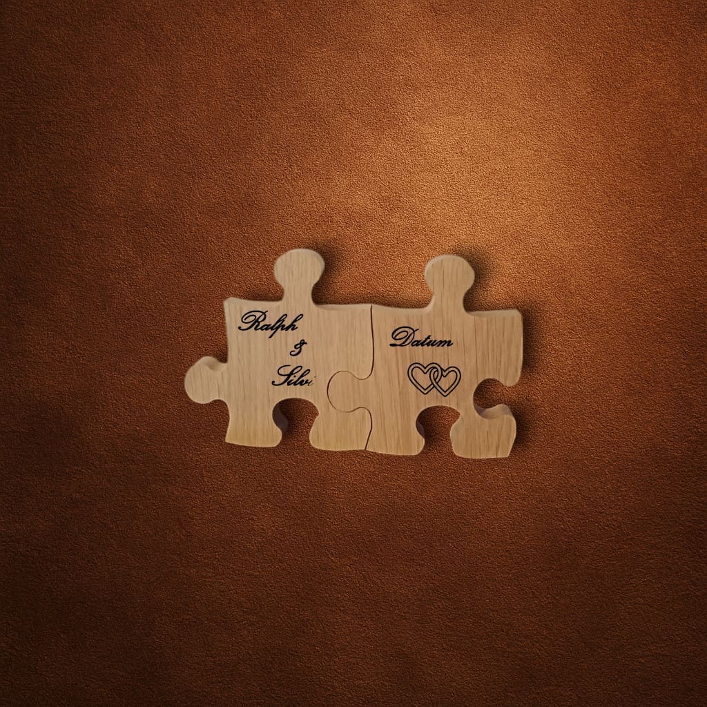 Du kannst die Namen, ein Datum, Symbole wie Ringe oder Pfoten und sogar persönliche Botschaften eingravieren lassen. Die Puzzleteile sind so gefertigt, dass sie perfekt zusammenpassen – genauso wie ihr.